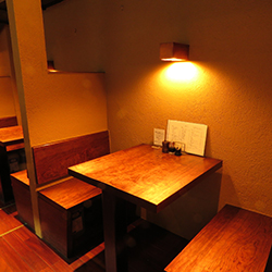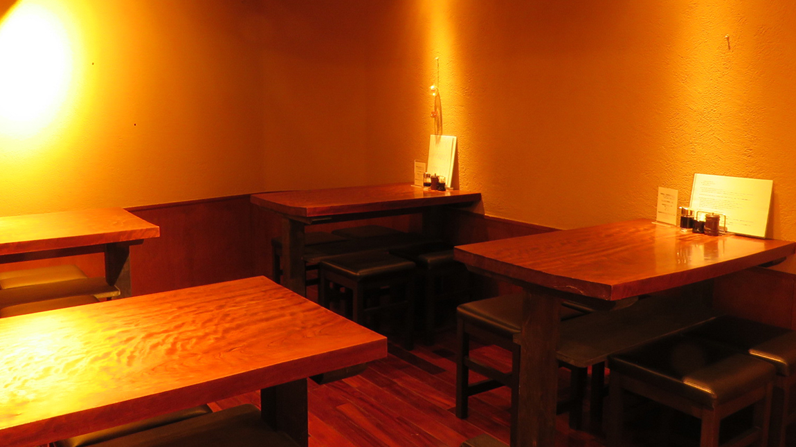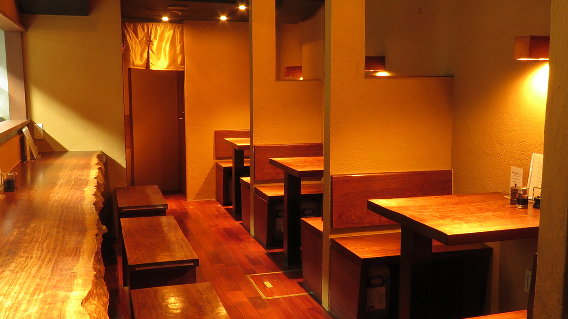 木材を基調とした温かみある落ち着いた雰囲気の店内。お一人でもくつろぎやすいカウンター席に、2名用・4名用のテーブル席をそれぞれご用意しており、仕事帰りのちょい飲みやデート、各種宴会など様々な用途でのご利用が可能です。 翌朝5時まで営業しているため、終電を逃してしまった!などという際にも安心してご活用ください! 都会の喧騒を忘れさせる隠れ家的空間で、お客様のひとときをおもてなしします。