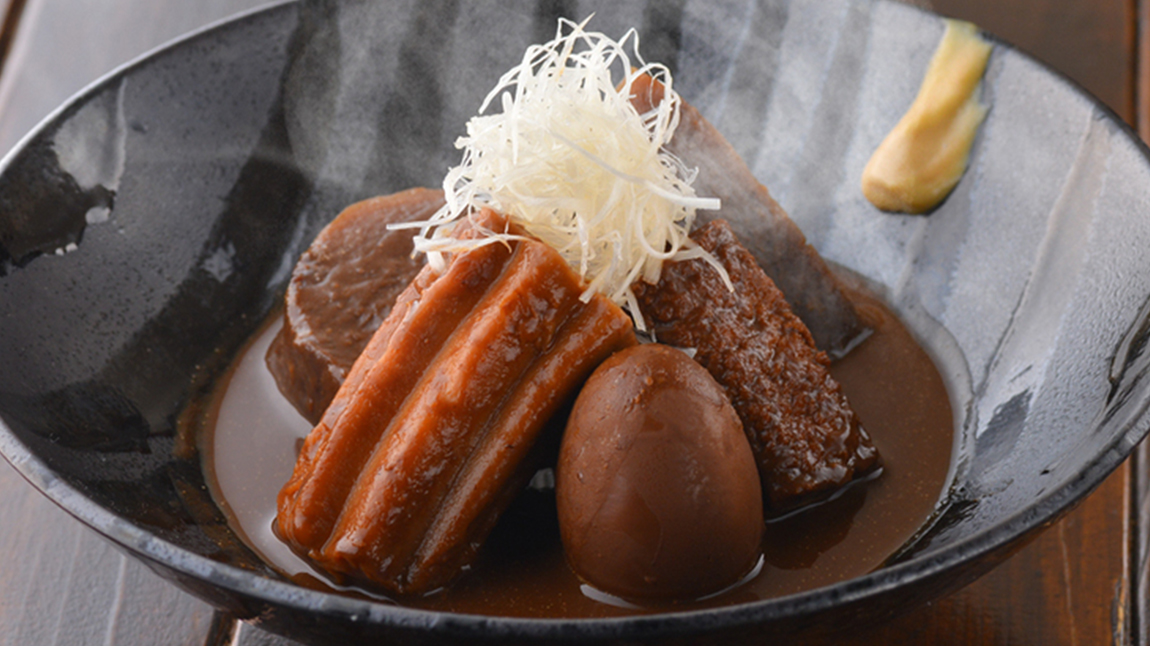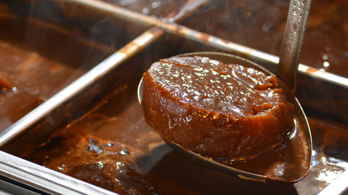 いつでもおいしく召し上げっていただけるよう冬季はアツアツの状態で、夏季は冷やしてさっぱりと!時期に合わせ提供。 味噌のやさしい味がたっぷりとしみ込んだ逸品です。