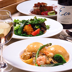 ディナータイムには、前菜・メイン・デザートまでじっくり食事を楽しむことができるコースを2,300円からご用意。スパークリングワイン含む2h飲み放題も1,400円で追加できるので、各種宴会にも最適です◎ また、ランチタイムにはお好きなメインに+200円でサラダ・デザートが付くセットメニューもございます。セットにはすべて食後のコーヒーもお出しするので、束の間の休憩時間をちょっとした癒しのひとときにも♪
