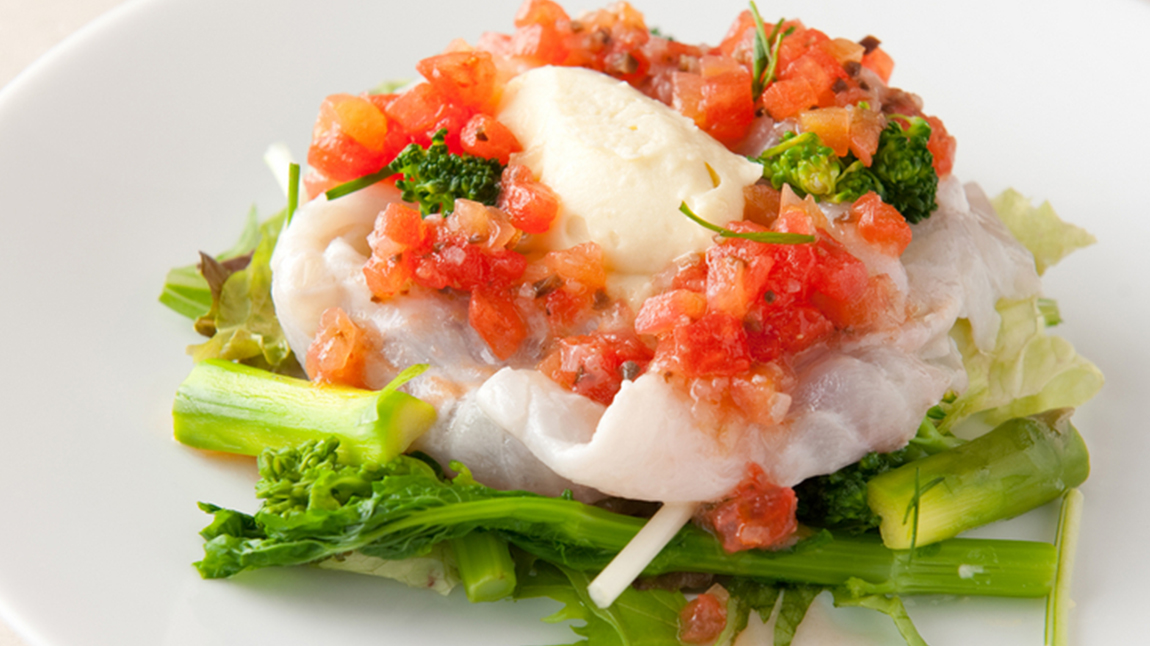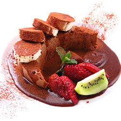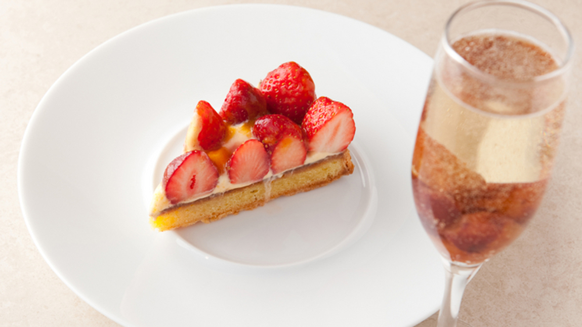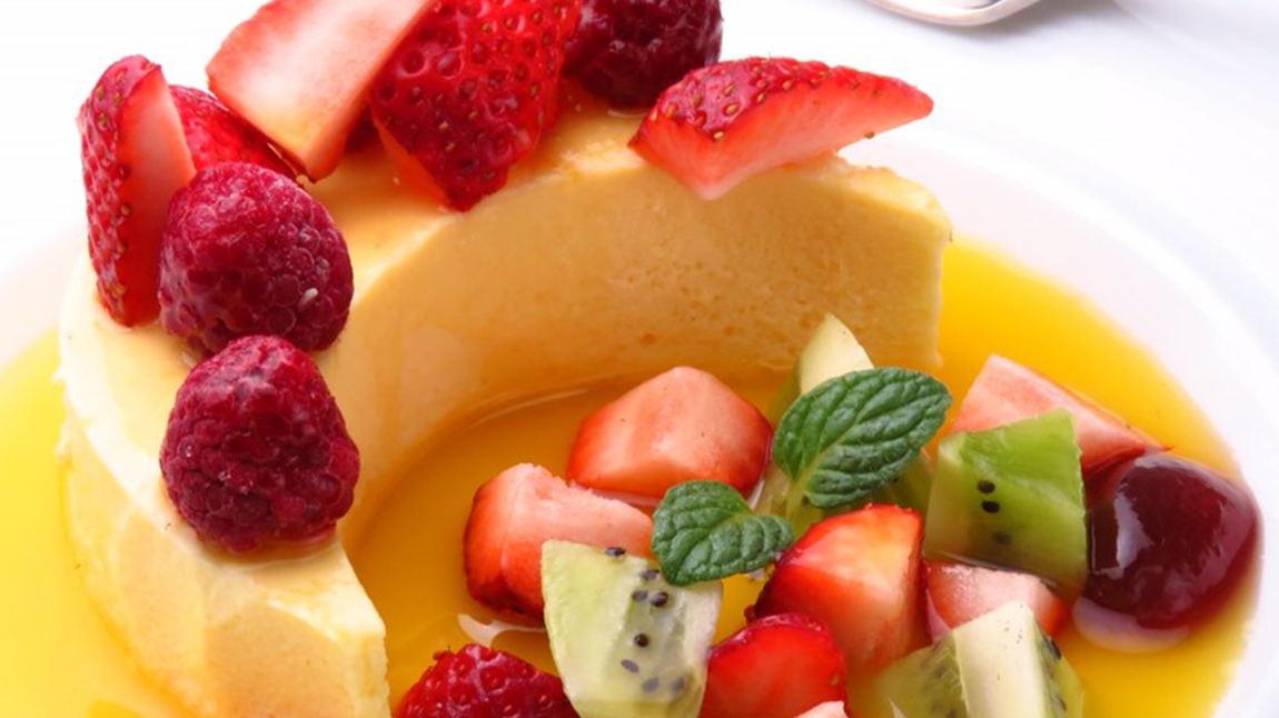 スープ仕立ての日替わりデザートは、なめらかな舌触りのスフレグラスと、小さくカットしたケーキ、季節のジューシーなフルーツを盛りつけた一皿。濃厚なシチューの後にも召し上がりやすいよう、上品で爽やかな甘さに仕上げました♪ 見た目も華やかなので、思わずぱしゃりと写真を撮りたくなると女性のお客様を中心に大好評いただいてます。