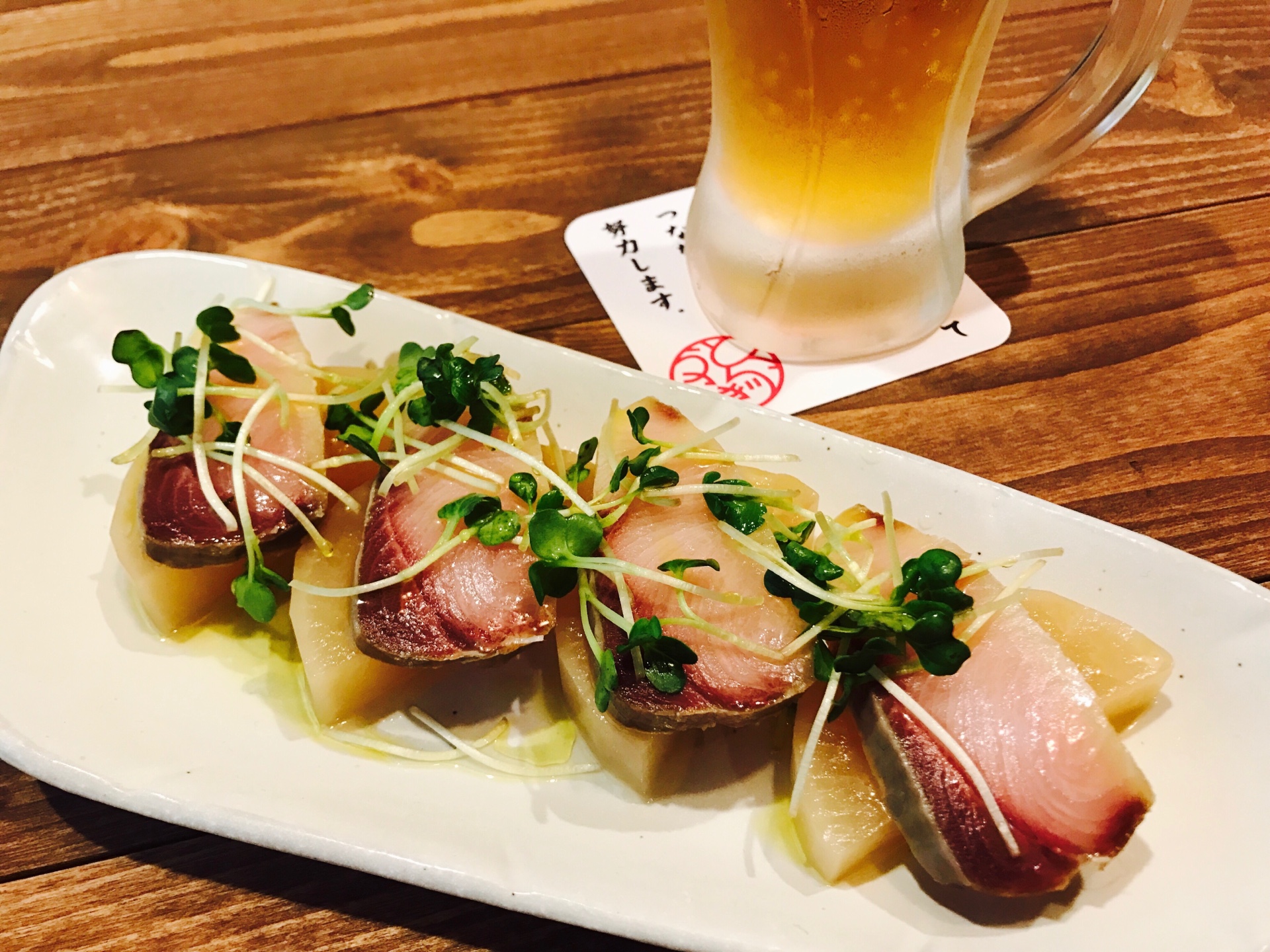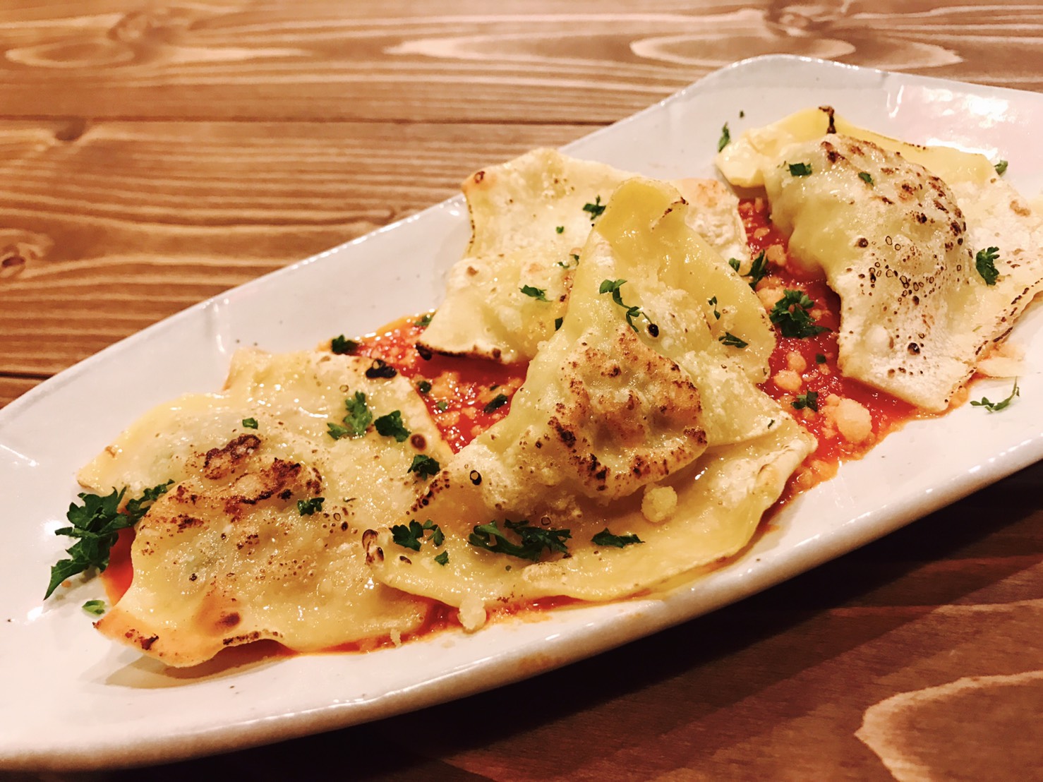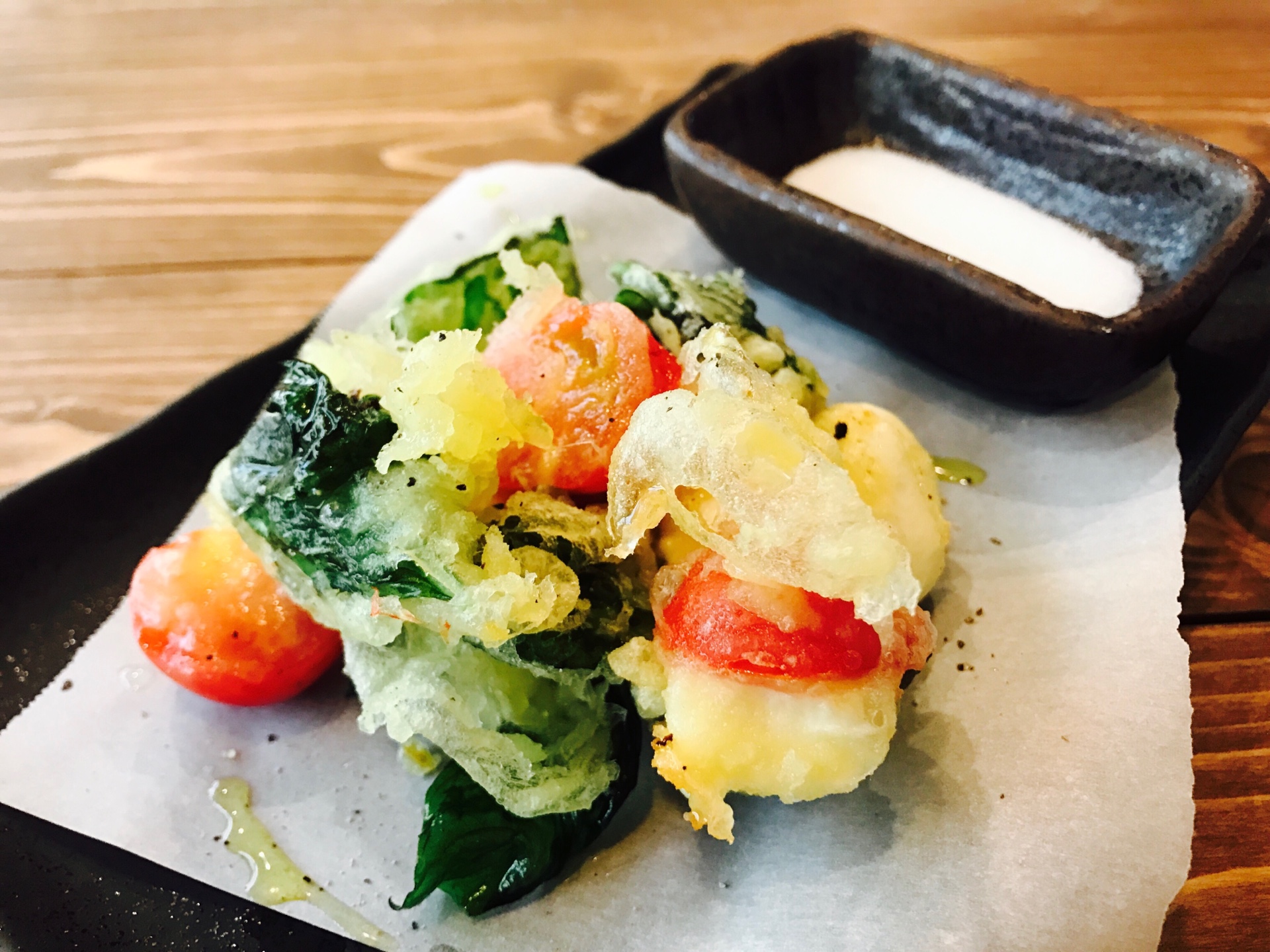 餃子みたいな「焼きラビオリ」、トマト&モッツアレラチーズをうまくまとめた「カプレーゼのかき揚げ」、サバ味噌じゃなくて「サバのホワイト味噌煮」、「エビチリのラザニア」、サーモンをカツレツ風に揚げた「カツレツ風サーモンマリネ」などユニークなメニューがいっぱい!
