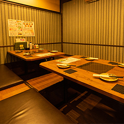 木目を基調とした明るい雰囲気のお洒落な店内。わいわいと盛り上がるのに最適なテーブル席と、足を伸ばしてくつろげる掘りごたつの席がございます。6名様から利用できる扉付きの完全個室も多数あり、お子様連れの方や女子会、合コンでも周りを気にせずプライベートな空間でお過ごしいただけます。